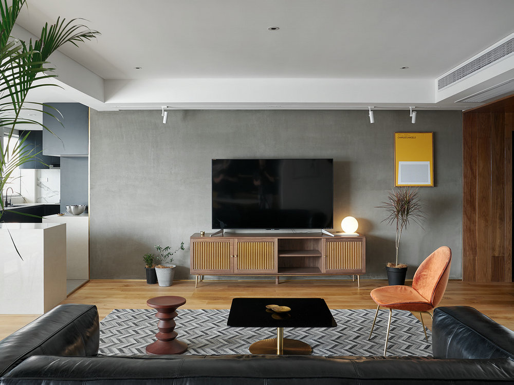 客廳家具的陳設(shè)更是貫徹了舒適生活的態(tài)度。映入眼簾的是,便是米色的雙人座沙發(fā),為做搭配還放置了同色單椅。對(duì)側(cè)還有一個(gè)愛瑪橙單椅,愈加提亮了室內(nèi)色彩。巖板茶幾+角幾的配置,方便儲(chǔ)物的同時(shí),打造別樣的空間美感。
