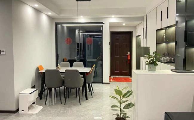 采用客餐廳一體設(shè)計(jì),最大化利用公共空間。中間沒有設(shè)置隔斷,而是利用吊頂設(shè)計(jì)從視覺上加以區(qū)分。這樣同時(shí)實(shí)現(xiàn)了客餐廳的功能要求,顯得美觀又實(shí)用。
