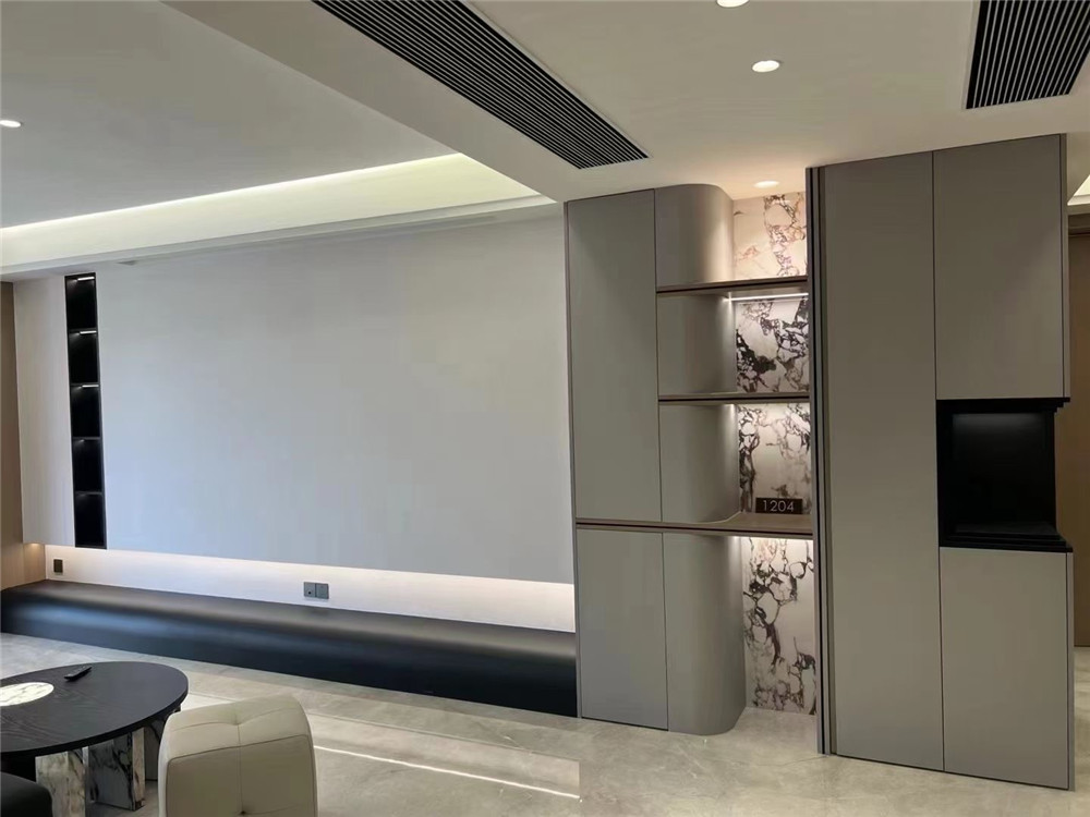 淺色地面與白色墻面構(gòu)成明亮基底,搭配深色木質(zhì)收納柜形成視覺(jué)焦點(diǎn)。底部設(shè)有3D壁爐,加上兩側(cè)墻面的壁燈暖光,為空間增添溫馨感。
